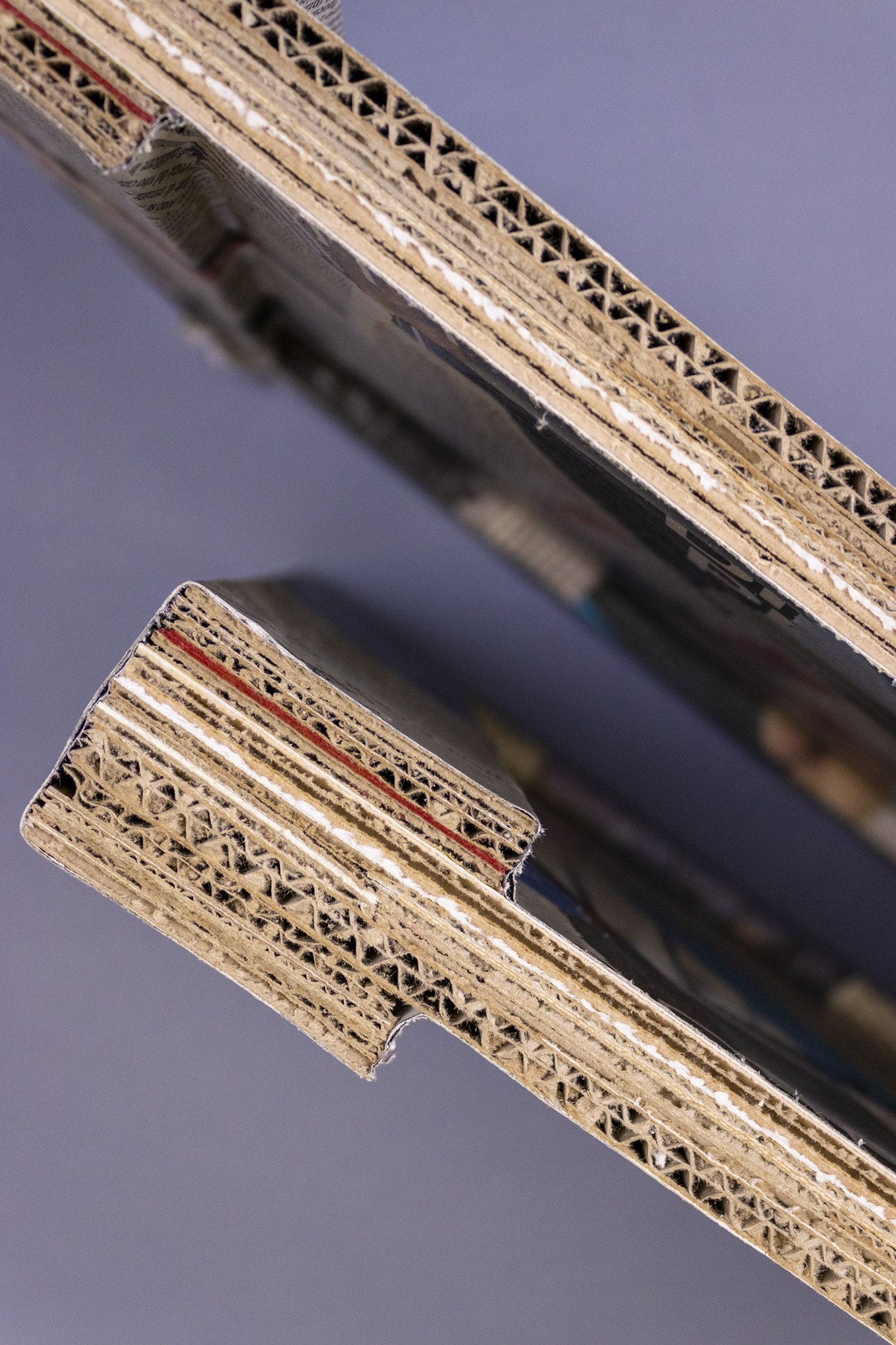 Un Senzaquadro visto dall'interno, dettaglio che mostra i rifiuti di imballaggi pressati manualmente che creano la struttura della cornice.